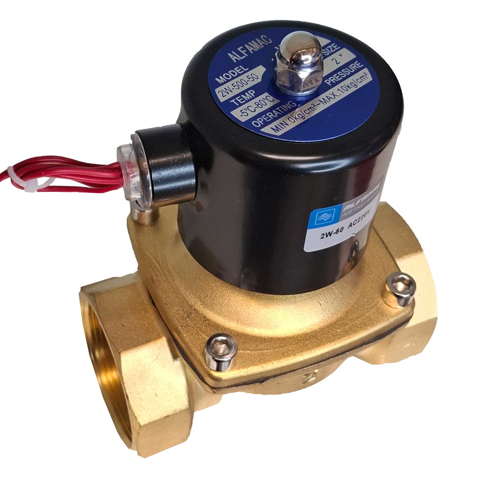 شیر برقی ۲/۲ دیافراگمی الفامک سایز 2 اینچ و بوبین 220 ولت از انواع پرمصرف شیر تحریک الکتریکی هستند که در بازار با نامهای شیر برقی 2-2 پنوماتیک و شیر برقی سری 2W نیز شناخته میشوند.این شیرها اغلب با ساختار عملکردی نرمال بسته (Normally Closed) عرضه میگردند و این بدان معنی است که در شرایط عادی و بدون تحریک بوبین، مسیر عبور سیال در این شیرها بسته است.بدنه این شیرها در تمامی سایزها از جنس برنج مرغوب و دیافراگم به کار رفته در آنها از بهترین انواع NBR میباشد. کاربرد شیر برقی ۲/۲ پنوماتیک سری 2W علاوه بر سیستمهای پنوماتیک، قابلیت استفاده در مدار انتقال مایعات از جمله آب و انواع سیالات تا ویسکوزیته 20CS (غلظت تقریبی 20 برابر آب) را دارند.به جهت مصرف بالای شیرهای 2-2 در جریان آب، این تیپ از شیرهای پنوماتیک با نام شیر برقی 2/2 آب هم نامیده میشوند.فشار نرمال کاری شیر برقی ۲/۲ دیافراگمی برای سیستم های هوای فشرده تا 10barمیباشد. همچنین شیرهای سری 2W قابلیت کار در شرایط دمایی 5-°C تا 100°C را دارند.